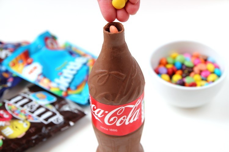 As soon as you were convinced that the chocolate froze well, we took out the bottle and carefully removed it with the help of a construction knife. The label and cap should be left to decorate the chocolate bottle. With the help of the funnel, we will fall asleep M & M »s and other small candies, put on the lid - and the chocolate bottle is ready.