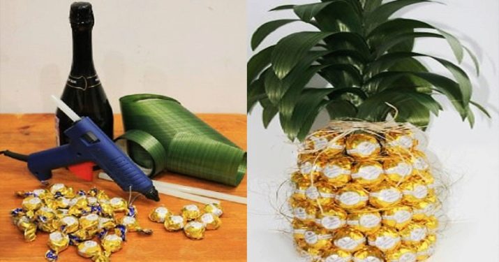 To make such a pineapple, you need candies with a golden wrapper, decorative green paper and champagne itself. Glue the bottle of candy in a circle. Pineapple tail do this: cut out the paper petals of different sizes. Three or four largest petals glue together so that they form a round hole. Next, glue the remaining petals in a circle and put on the resulting tail on the neck. Done!
