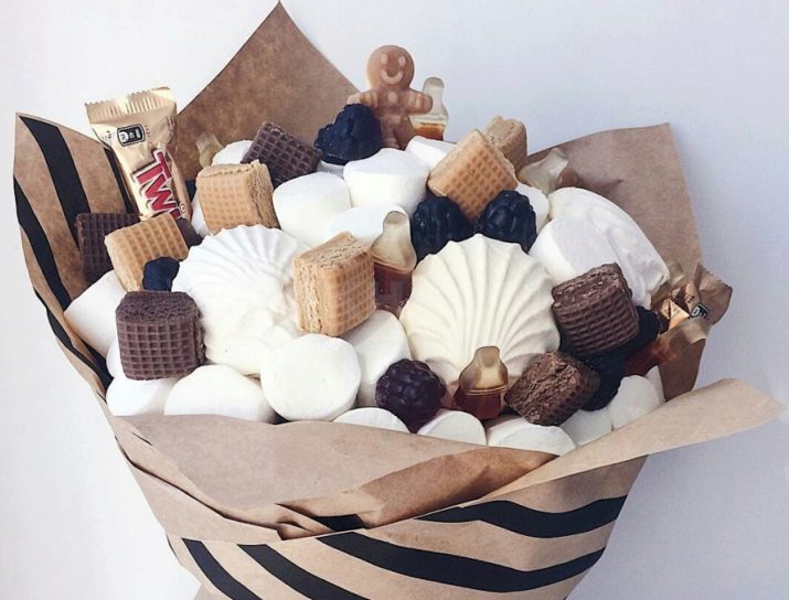 - Bouquet of sweets. Everyone knows that flowers are a very beautiful gift, and a candy bouquet is also a tasty present. It can be purchased at the store, such a bunch will include several types of chocolate and other sweets. And you can make it yourself. Such a surprise includes a note with pleasant words.