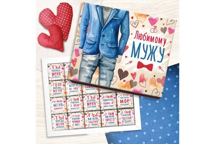 - With the message. Such sets can consist of sweets, on the wrappers of which love confessions, compliments and just warm words are written.
