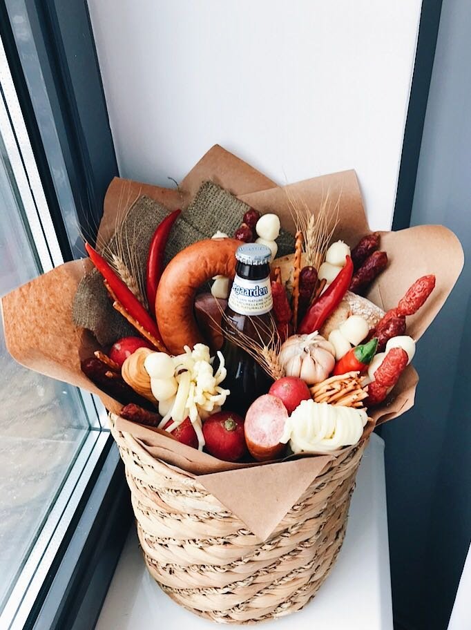 You can cook for your chosen beautiful bouquet of products. You will need to buy sausage, bread, cheese, vegetables and greens in the store. And also it is necessary to prepare wooden skewers in advance. Put all the edible ingredients on the skewers, fold them together with the skewers down and turn them upside down. Wrap the upper part of the skewers with duct tape. Bouquet wrap a beautiful wrap. Secure it with scotch tape, tie a bright ribbon.
