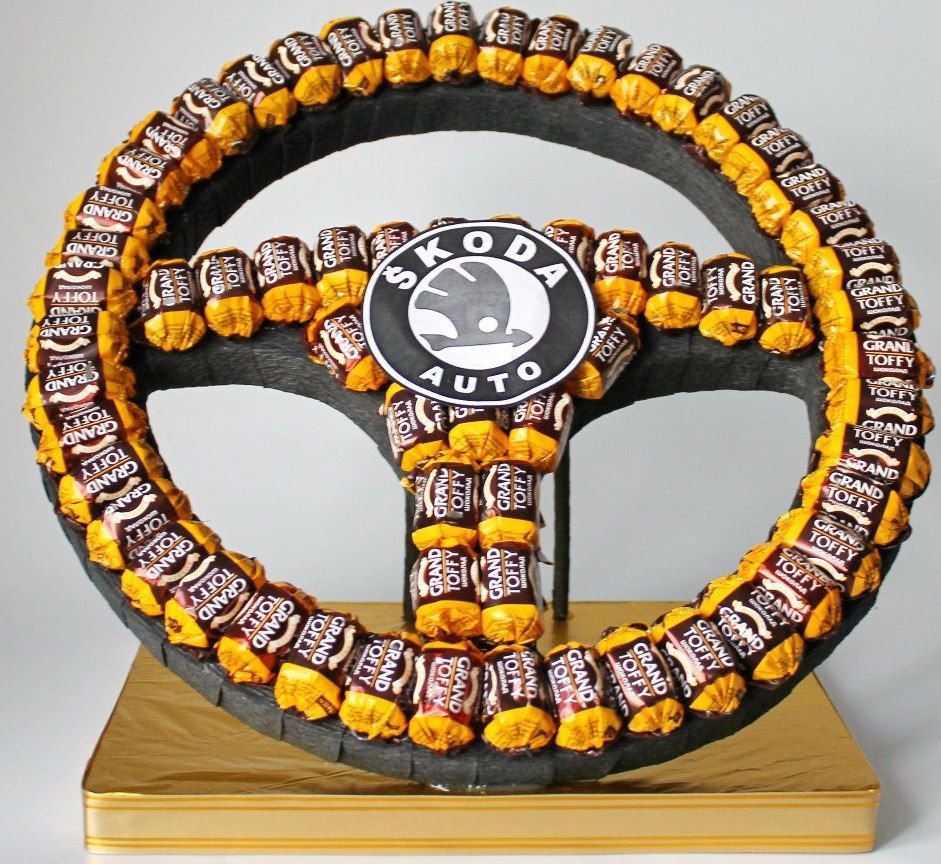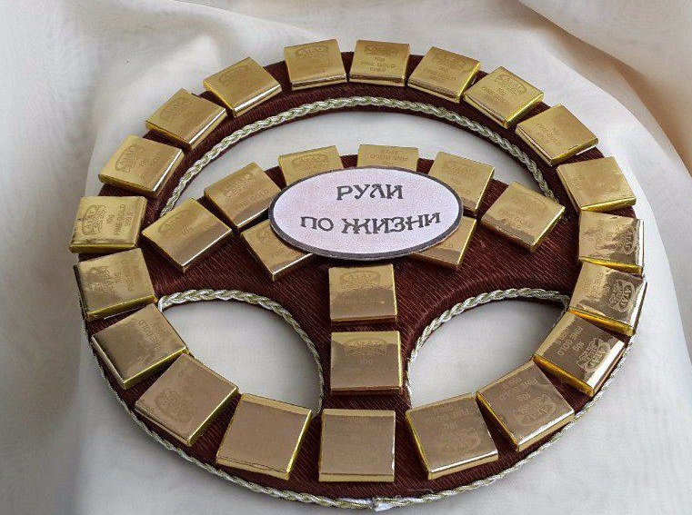 Present a sweet candy gift to a man. Fold it in the form of a steering wheel. You can make it using a cardboard sheet. Cut out the shape of the base for the steering wheel. Cover the steering wheel with a dark color. Grab the wheel with various interesting candies.