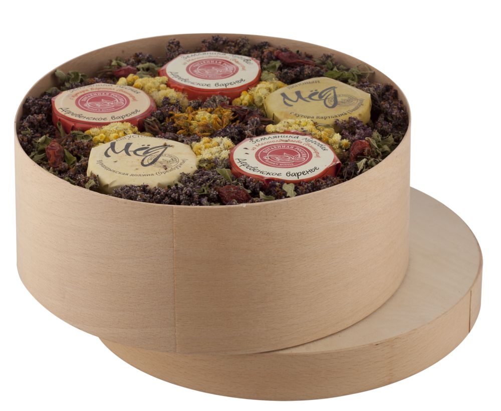 - We put flowers and "nuts" in the middle of the lid and glue them with a glue-gun. Wrap the box with a yellow ribbon, tie an interesting bow. Put everything you want inside the box, close the lid.