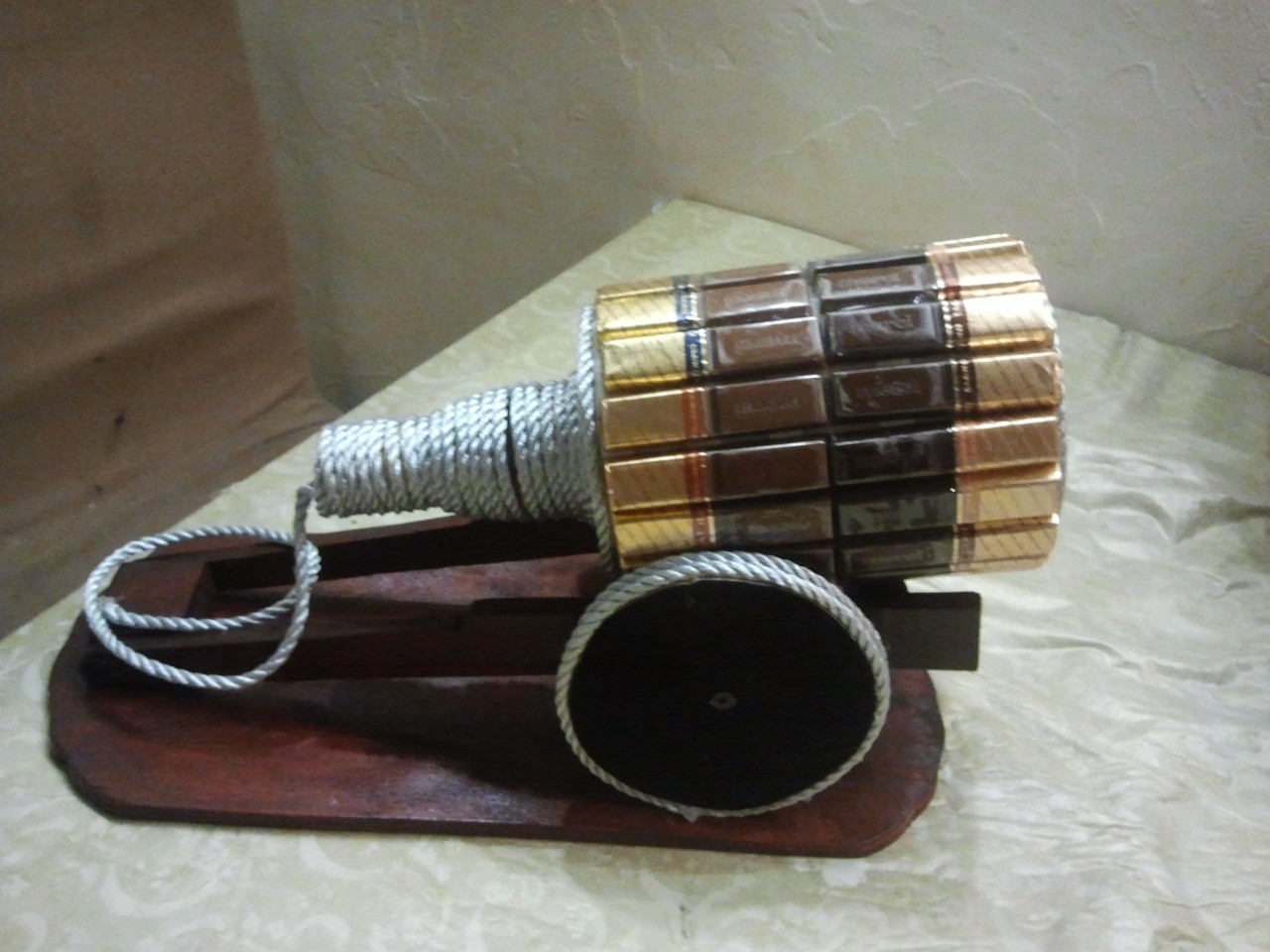 - A bottle of herbal balm decorate with ribbons. Fill the box with nuts, crackers, fish. Then wrap it with paper. So you perform the base for the gun.