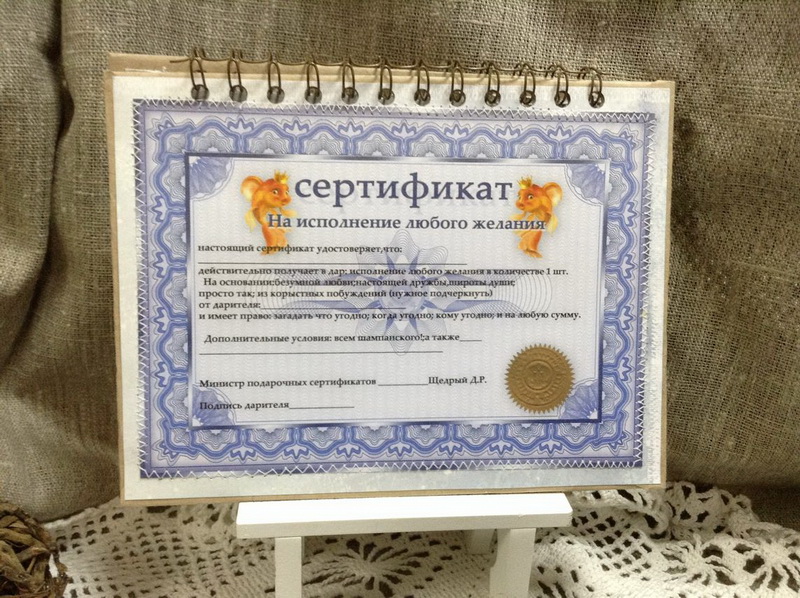 Certificate of fulfillment of three wishes which can be additionally framed, will be an unusual surprise for every man. In such a certificate, it is usually indicated in whose name it was issued, and in the wish list the boxes remain empty, so that the certificate holder can write what he wants.