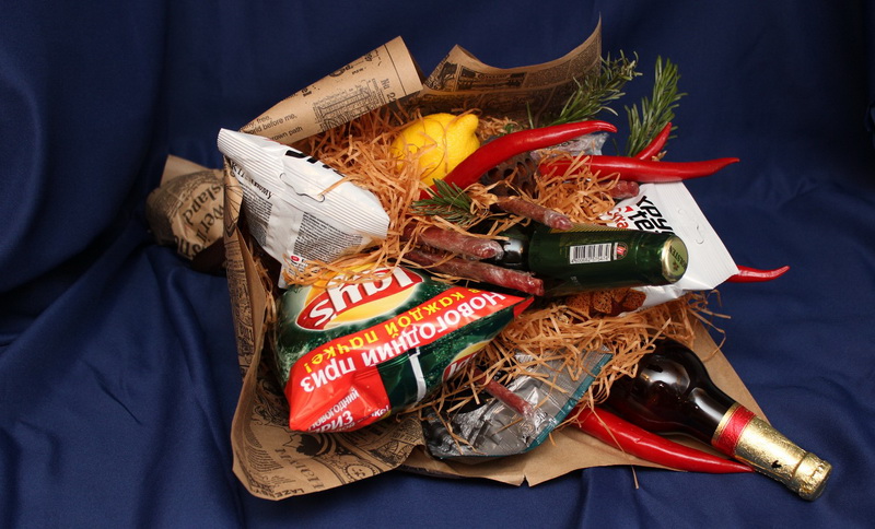 Edible bouquet with a bottle of alcohol and snacks to it will be a pleasant and tasty surprise for every man. The tendency to give edible bouquets to representatives of the strong half of humanity is becoming more and more popular every year, and the ingredients used in their manufacture are becoming more and more diverse. For example, a bouquet may consist of a bottle of wine, cheese, bacon, pepper pods, garlic heads, bunches of fresh greens, hunting sausages and other meat products, which are decorated in a beautiful composition and decorated with gift wrapping.