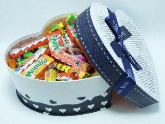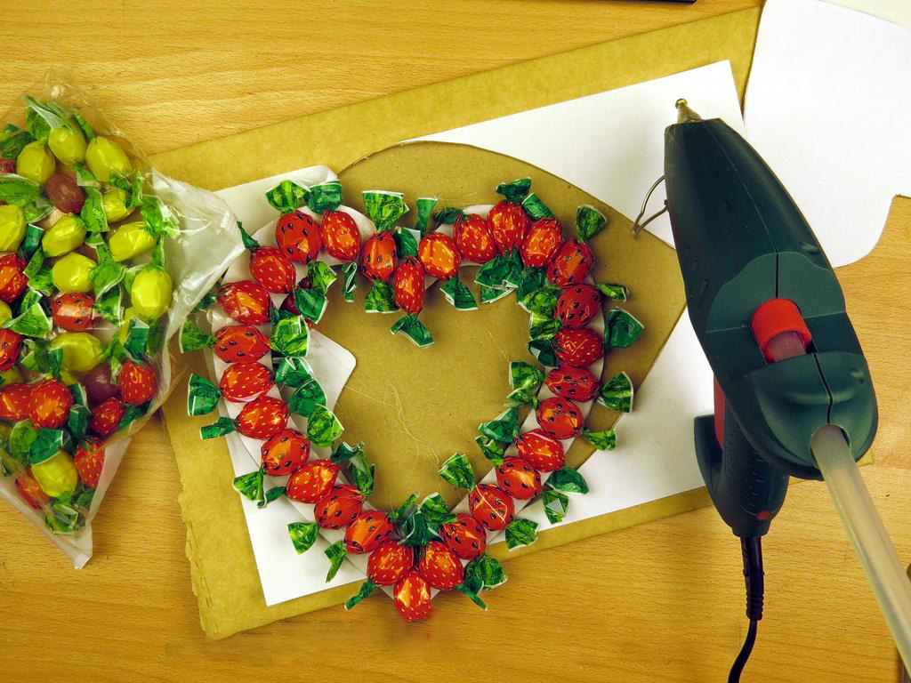 - An interesting gift for your beloved - sweet valentine. To make it, you need to pre-cut a large heart out of cardboard. After that, on a cardboard base you will need to stick candies in a bright red wrapper. To fix the sweets, it is recommended to use double-sided tape. Stick the candy gently. The result will be an original tasty gift.