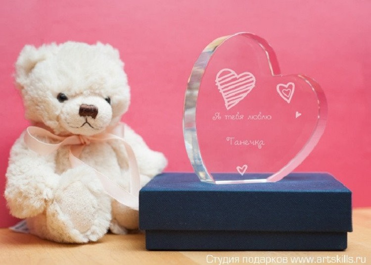- If a girl likes souvenirs, then she can be given an unusual gift - a glass reward in the form of a heart with laser engraving. Such a non-trivial souvenir reward will be a successful romantic surprise.