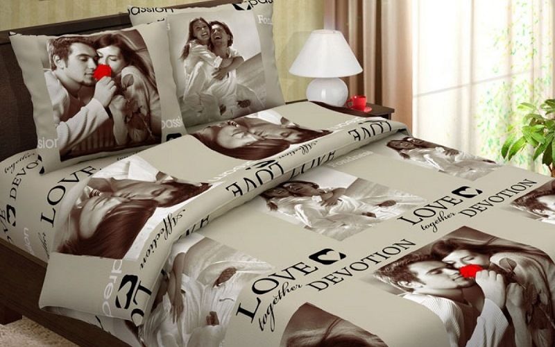 - Non-standard solution - bed linen with your joint photo. Thanks to modern technology, it has become possible to give various materials absolutely any appearance. In this situation, you will need to put a photo on the fabric of which the bed linen is made. If you want, you can add this non-trivial gift with gentle wishes and confessions.