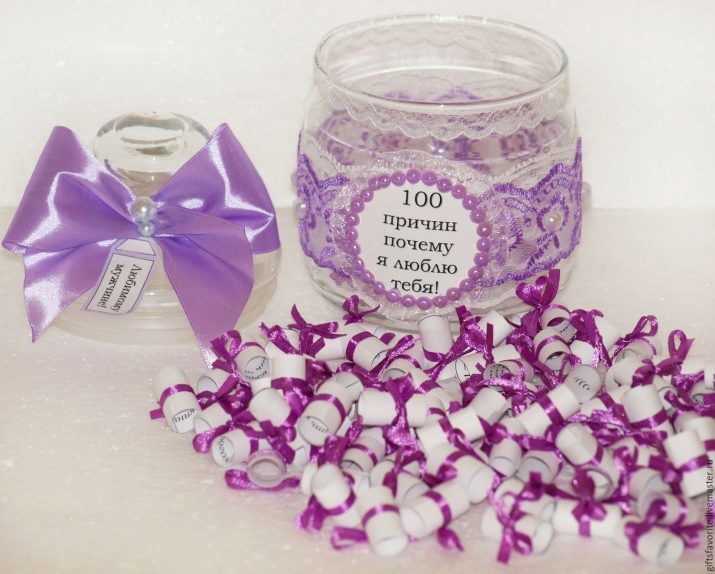 - A nice gift will be a jar "100 reasons why I love you." The outer side of the container can be arranged at its discretion, for example, wrap gift paper. Inside the jar will need to lay a little twisted pieces of paper written on them confessions. No need to skimp on the gentle words. A full jar can be put next to the bed, so that with the onset of the morning she immediately found her and was pleasantly surprised.