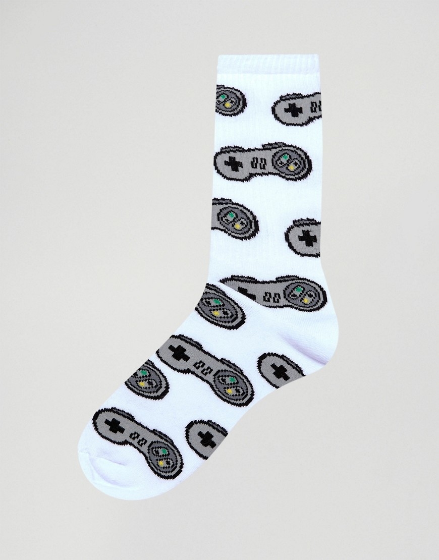 For example, socks with the image of the game console will delight every gamer.Also in the picture can be favorite cartoon characters, aliens, the logo of a favorite drink, and even the image of food: scrambled eggs, burgers, pizza and hot dogs.