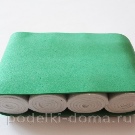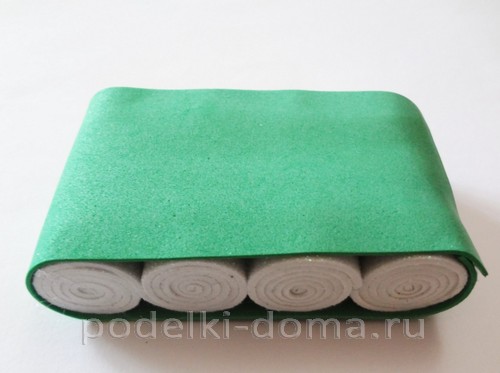 - Prepare the widest green stripe. Apply glue along the edges, attach the wheels.