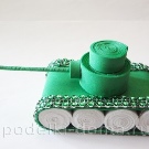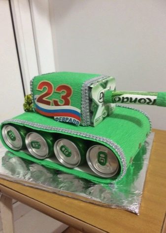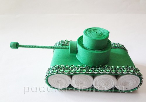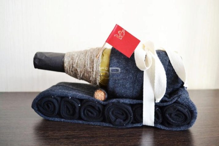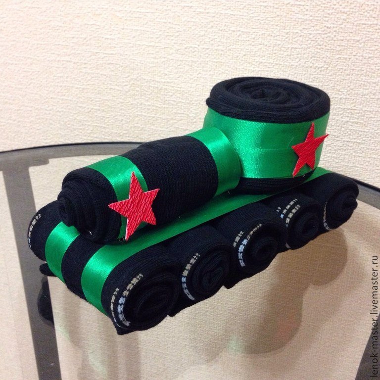 Can make interesting composition of panties and socks in the form of a tank, supplement it with a homemade barrel of paper or cardboard. Wind the last part with a string and fasten with it a small red flag in this place.