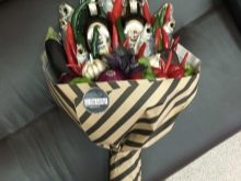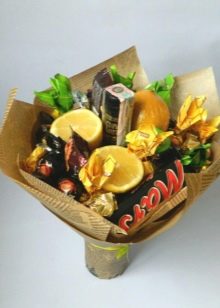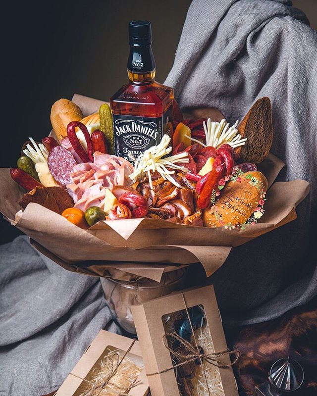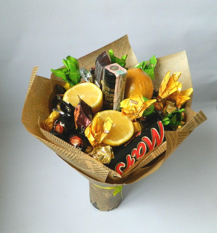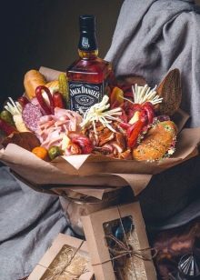 You can make a more original gift with fantasy. An interesting option - a bouquet of various products. For example, it can be a hearty combination of smoked sausages, chili peppers and smoked cheese. It is possible to add such an ensemble with an alcoholic drink. Of course, combinations can be collected and others, based on the tastes of men. As a rule, wrapping such edible bouquets in paper bags.