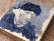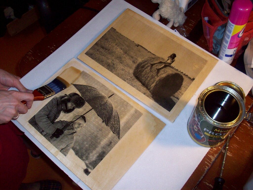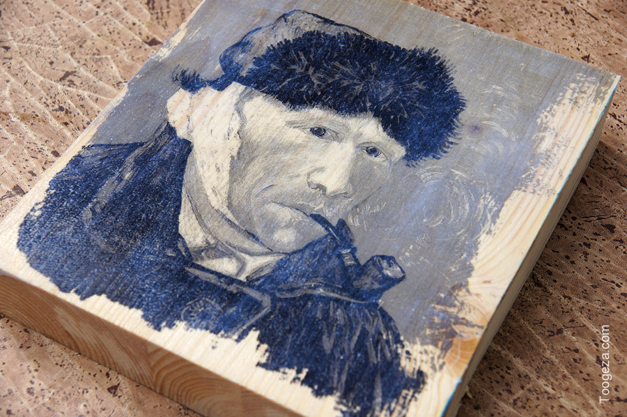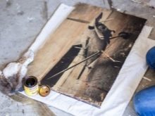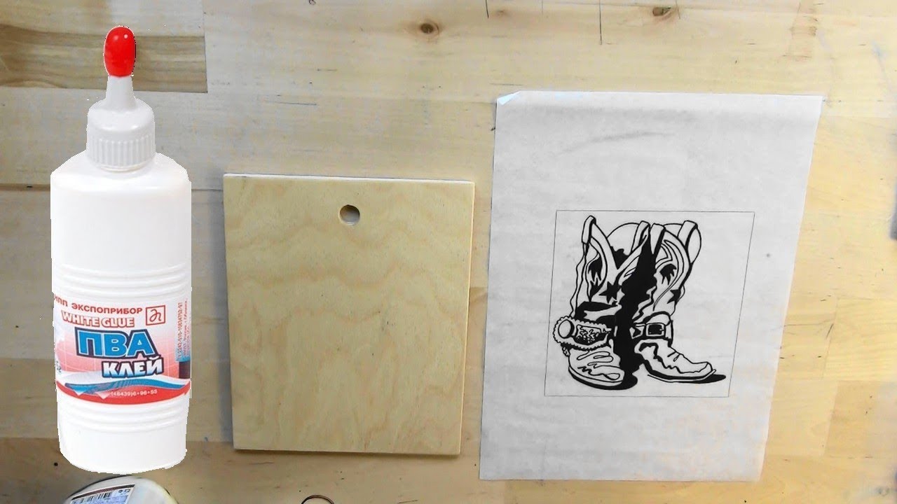 - While the gel is not fixed yet, Attach a leaflet with a prepared photograph to the wood. To work more conveniently, pre-crop the photo, moving along the contour.