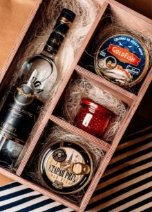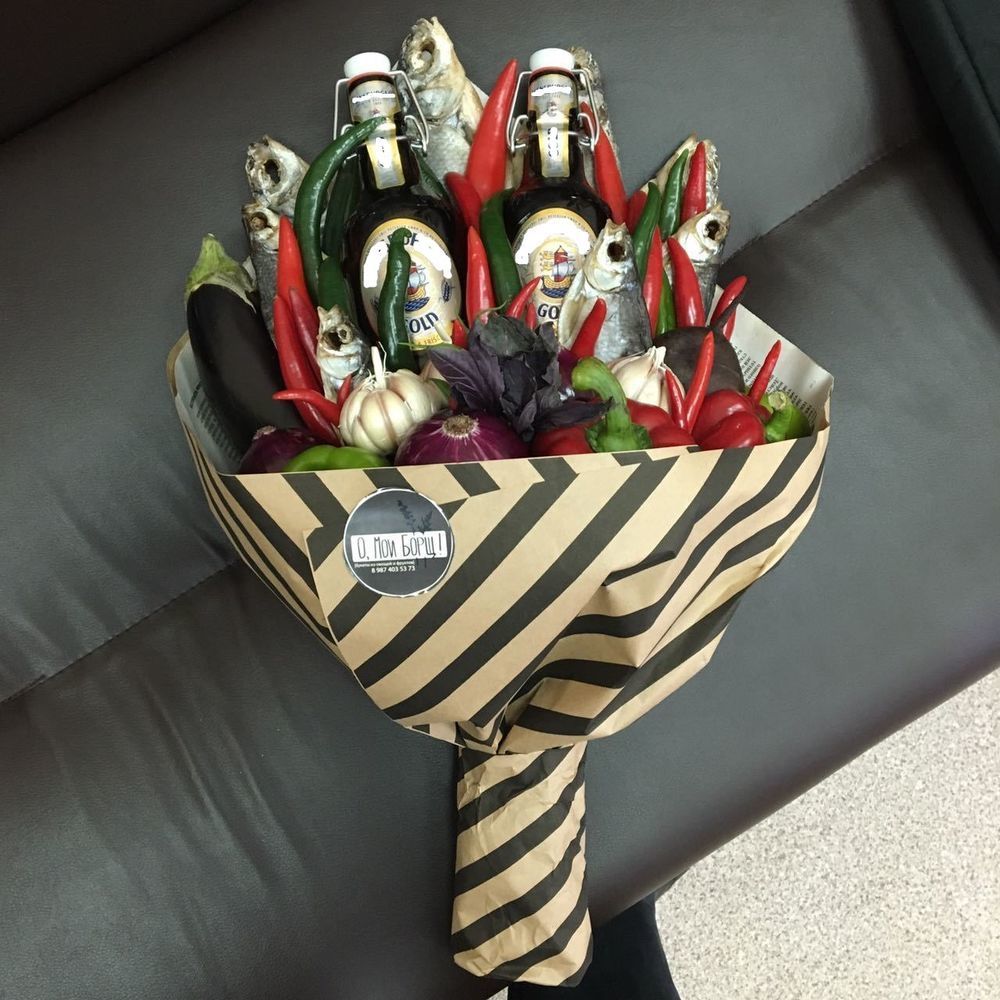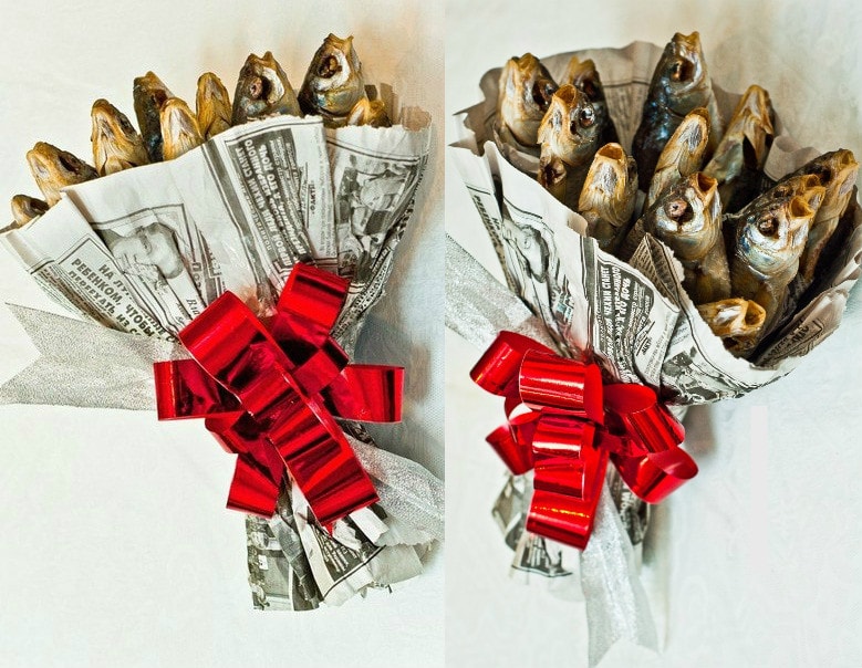 Extraordinary Present for February 23 - small bouquet of salted dried fish. You can wrap this composition of food with a newspaper sheet with a bright red ribbon. You can add a similar gift with a couple of bottles of beer.