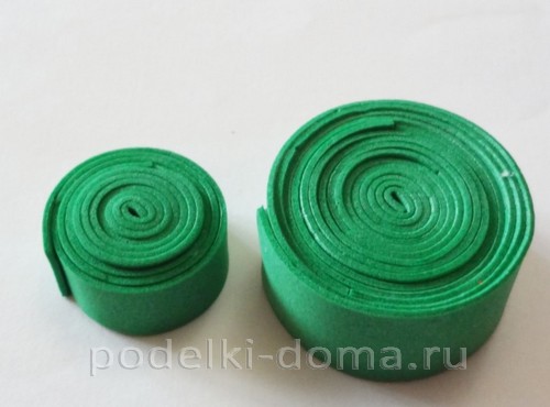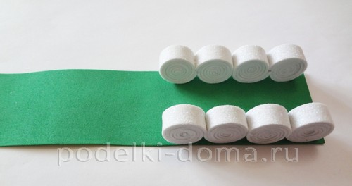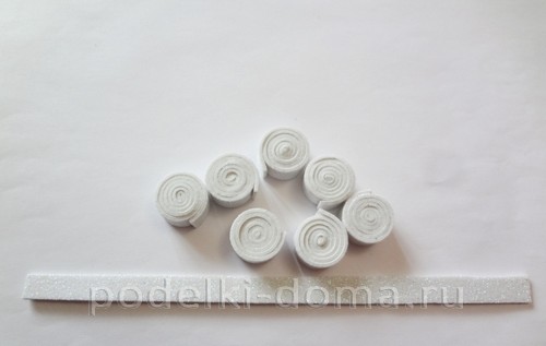 - Cut strips of white material. Each tightly twist, glue the tips. Wind the strip tightly so that all the wheels are the same.