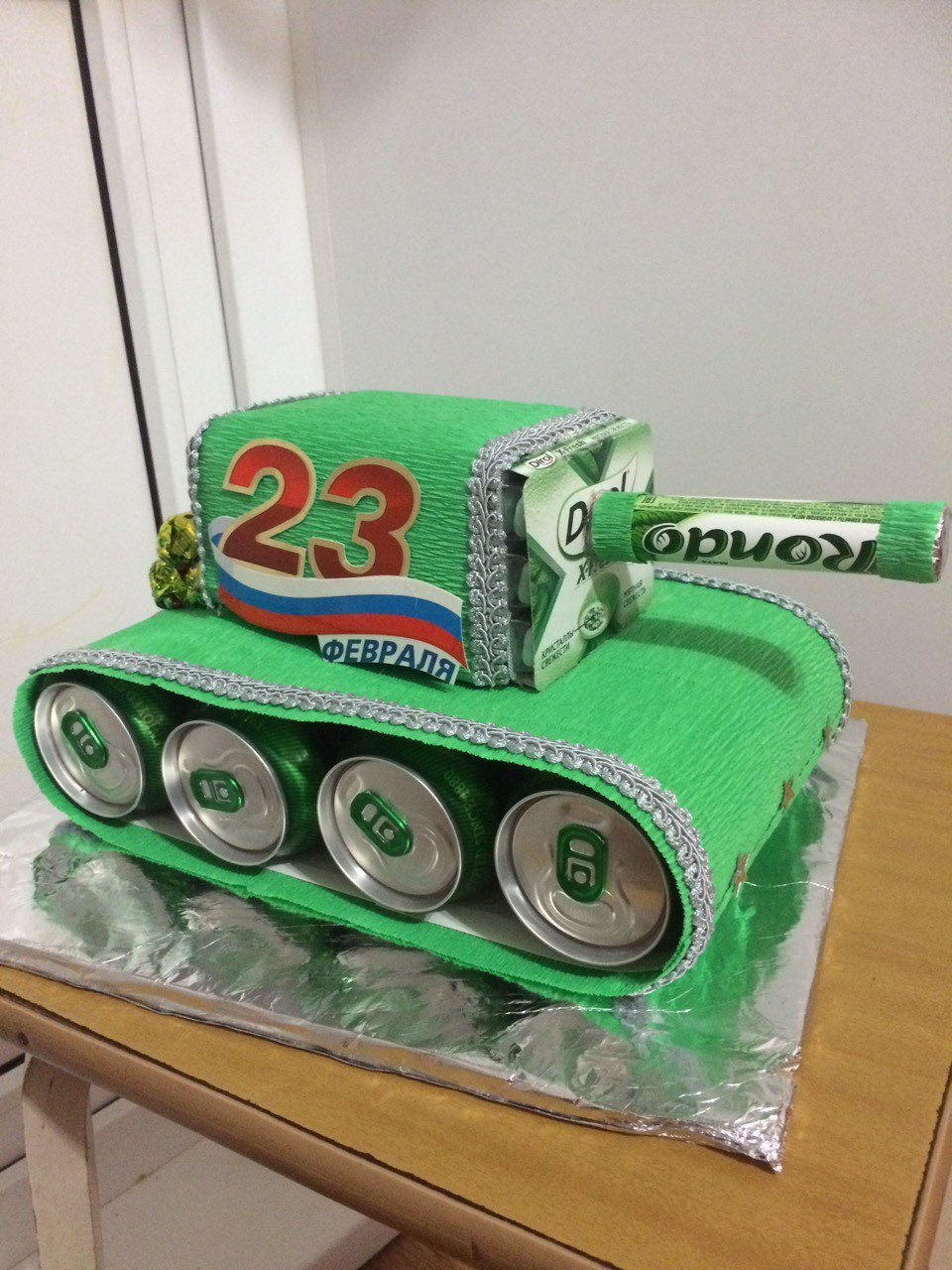 Another relevant sweet gift for a man on February 23 - beautiful and lush cake. It is desirable to add a large and expressive greetings.If there are no abilities to create such desserts, then it is possible to form a spectacular and unusual cake from different products. For example, it may be a composition of chocolates bonded to each other.