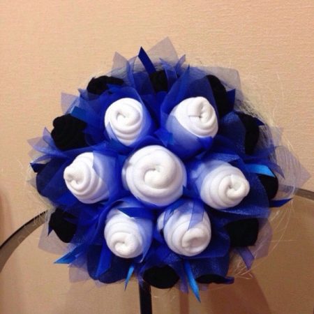 Bouquet of black and white rolled socks It will look much more interesting and brighter if it is complemented with a thin blue woven material.