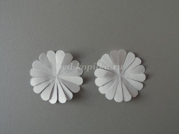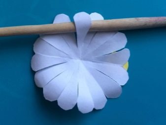 To make the daisy look more natural, we scroll the tips of the petals with scissors or a pencil with a pencil on the reverse side. Now you can arrange them in random order on our blank card. If you expect a bouquet of daisies, then from green paper, you can additionally cut the leaves and also stick.