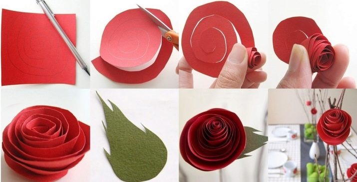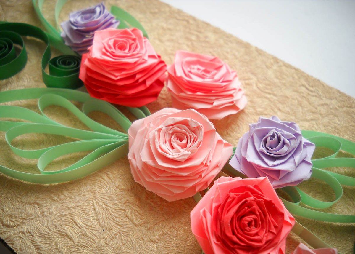 Rose - a great gift for March 8. Making it out of paper is a snap. Prepare colored paper shades you want. It can be both traditional pink and red tones, as well as unimaginable gold or blue. Cut out square squares from them. We will not give the exact size, since almost any square can be turned into a rose. Accordingly, the more will be his hand, the more will get a flower.