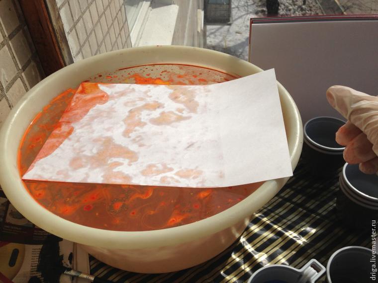 Now we need a sheet of cardboard. Gently lean it against the surface of the water. All colors will settle on the canvas. It remains only to dry the picture well and make a decent frame.