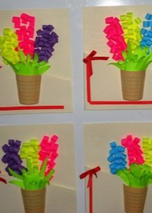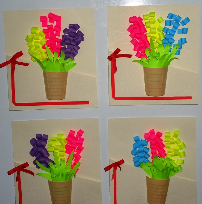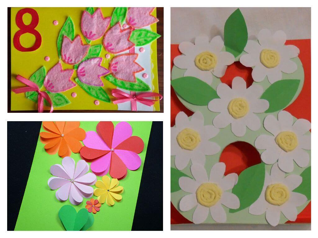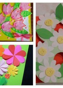 Cut the stem, leaves, flower, core out of colored paper with the child. Let the child choose the color of the parts. Help the baby to stick all the elements correctly and evenly onto the outside of the postcard.
