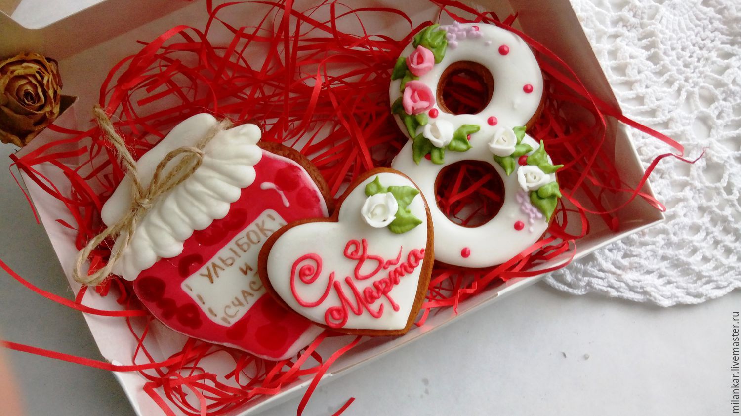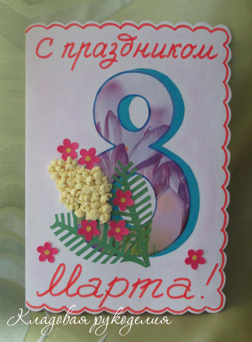 Glue below a flat piece of white paper and carefully write on it "From the 8th of March". To make the gift look more accurate, this inscription can be printed on the printer using a beautiful font.