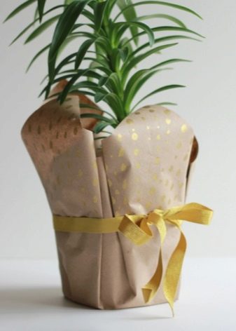 A potted plant is always a good gift idea. Before you pass it, do not forget about the beautiful packaging of the vase. It is best to create a wrapper yourself.