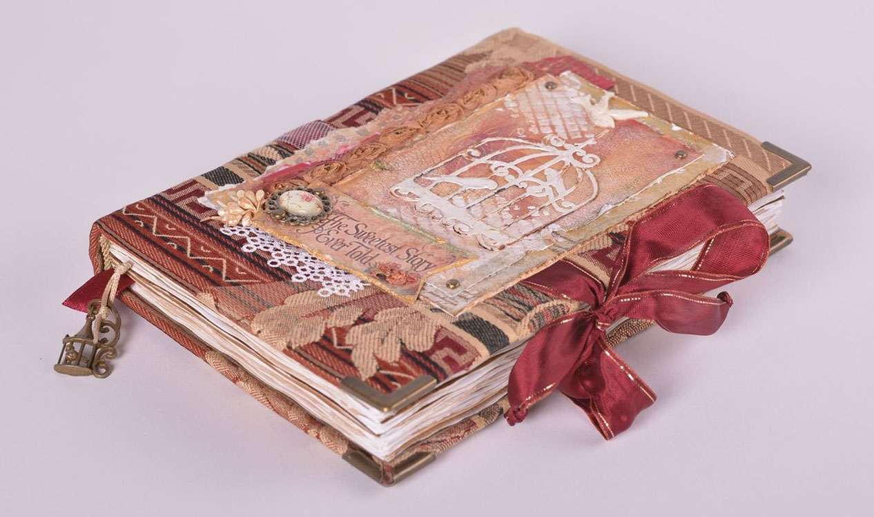 For example, this book can be wrapped in gray paper, equipped with old stickers from hotels and airports, printed at home. All of this might look as if she had traveled around the world for at least 50 years before reaching the addressee. This non-standard gift will be remembered for a long time.