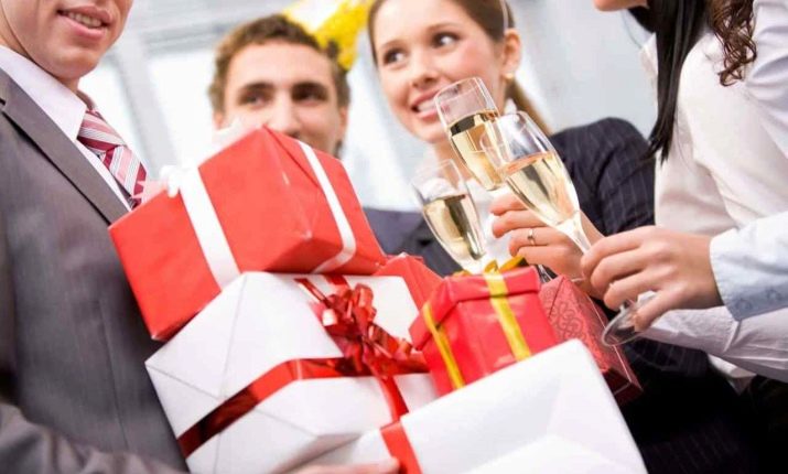 Universal gifts-compliments that are given to colleagues at work usually include elite alcohol, including champagne, aged wine, whiskey, rum and liqueur, as well as handmade chocolates (especially themed sets, sets with numbers and wishes). And also often the team presents a big cake to the birthday man.