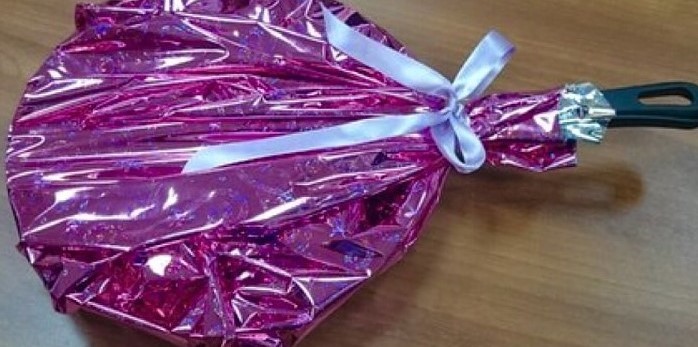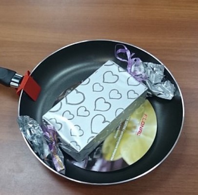 To make a gift a bright and positive impression, you can pack it in an interesting and original way. For example, you can purchase a griddle, put a mobile phone in its package on its bottom, and then wrap this item of dishes with gift paper so that its shape can be clearly traced.