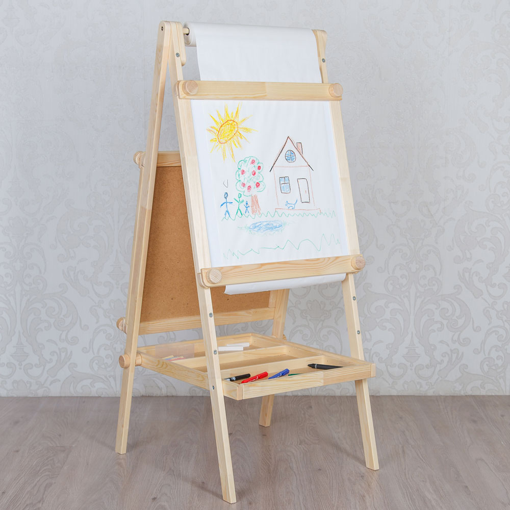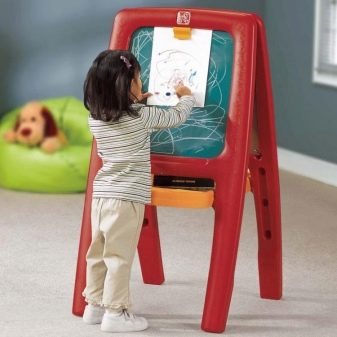 Children at any age love to draw. Someone prefers to draw with markers or crayons, and someone paints. In any case, the child will be happy with such a gift as a child's easel. This item is a double-sided board, on one side of which you can draw with chalk, and on the other with a marker or felt-tip pen. In addition, one side is magnetic, so you can easily attach a sheet of paper and draw with pencils or paints.. As a rule, such easels have a small shelf at the bottom where it is convenient to put pencils and you can place a glass of water in a special cell.