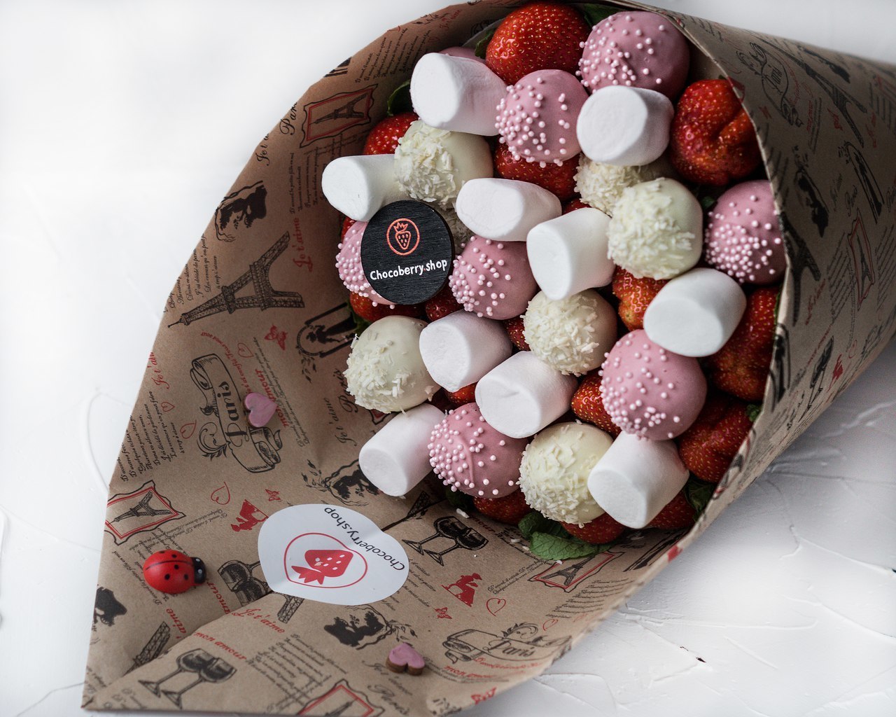 Each product is attached to the paper and each of them is given a certain signature, reflecting the attitude of the person to the birthday man. Usually these are pleasant words that characterize a person in the best way, or emotional greetings with wishes.