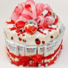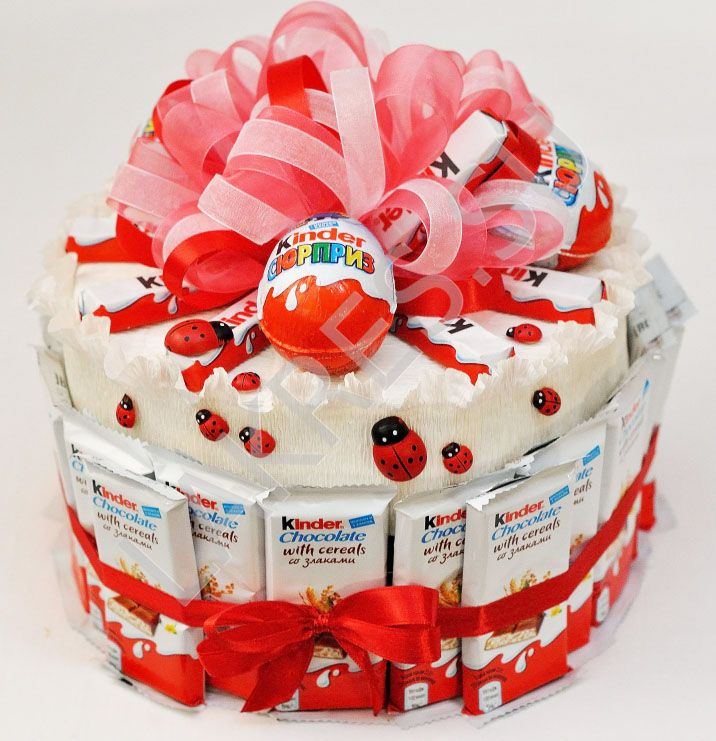 - Cake from sweets. Get a round box "Raffaello" or cookies in a tin, and around the perimeter, glue them with long chocolate bars. You can make this design with double sided tape. From above the composition can be decorated with bright candies or “Kinder surprises”.