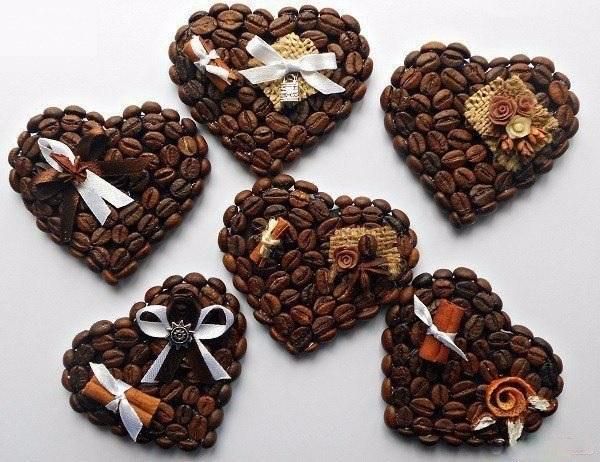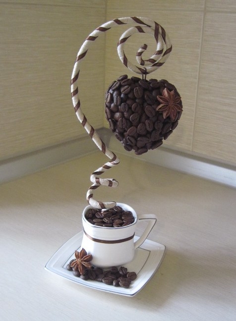 - Coffee decor. With the help of coffee beans, you can make interesting crafts in the form of a chic tree, a big heart, a stylish vase, and various candles. In addition, you can decorate with whole grains a large mug for coffee, a frame for a photo, create an unusual picture or even a large panel.