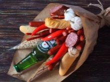 - Edible bouquet of sausages and cheese products. For the gift you will need thin sausages on a skewer, smoked cheese in the form of a pigtail, and in the form of a semantic load and a thin hint add thin fiery hot red pepper between the cheese and sausages. This gift will look beautiful if wrapped in kraft paper.