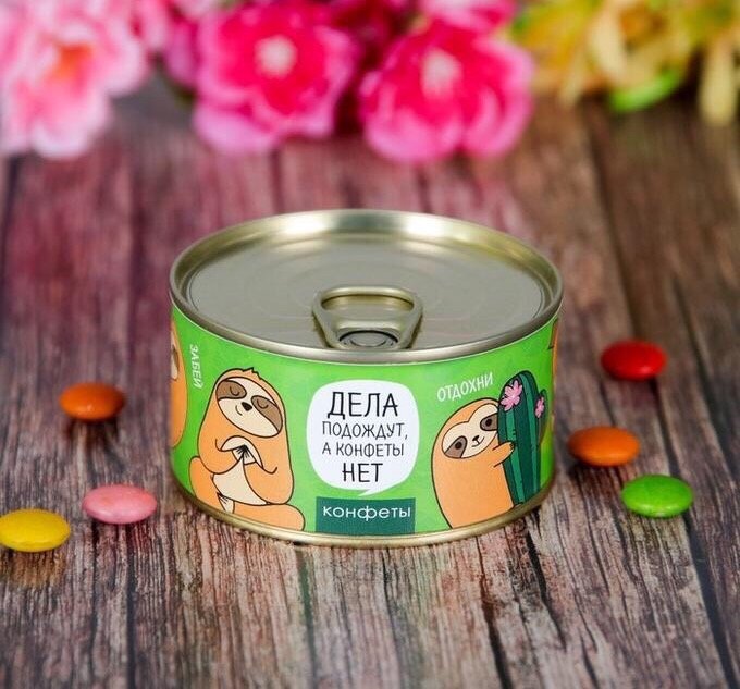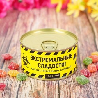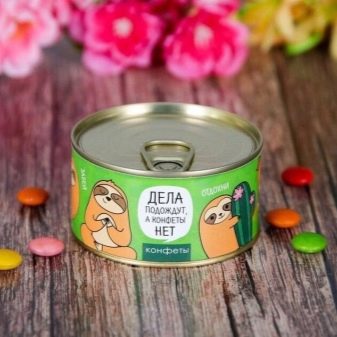 - Canned sweets. Just donating a box of chocolates is too trite. But what if you give sweet, which will be framed as canned? Marmalade, chocolates or pastila - it does not matter, the main thing is packaging. You can buy such sweets in specialized stores that sell gifts for practical jokes.