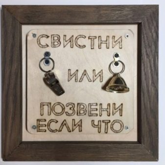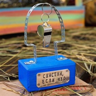 - Souvenir "Whistle if that". The design of the souvenir is a wooden base with an inscription and a whistle nearby. Nothing, except as a decoration for the desktop, such a gift can not be, but it will please the birthday with originality.