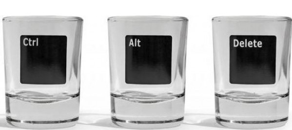 - A set of stacks "reboot the system". On the computer to restart the system, you need to simultaneously press three keys: Ctrl, Alt and Delete. The considered gift set consists of three piles on which these keys are printed one by one. The humor lies in the fact that in order to "reload" the body, you need to drink three piles of strong drink.