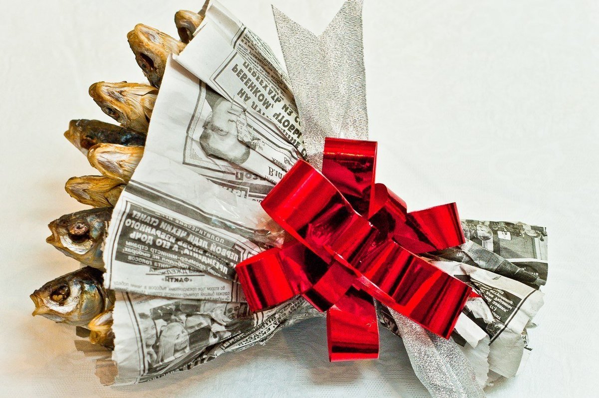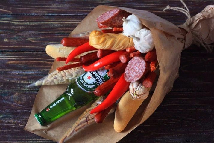 - A bunch of products. While women prefer floral arrangements, a man can present a bouquet of other ingredients as a gift: sausage, cheese, bottles of beer. Enough to arrange a grocery basket in the form of a bouquet of flowers, and the original gift is ready.