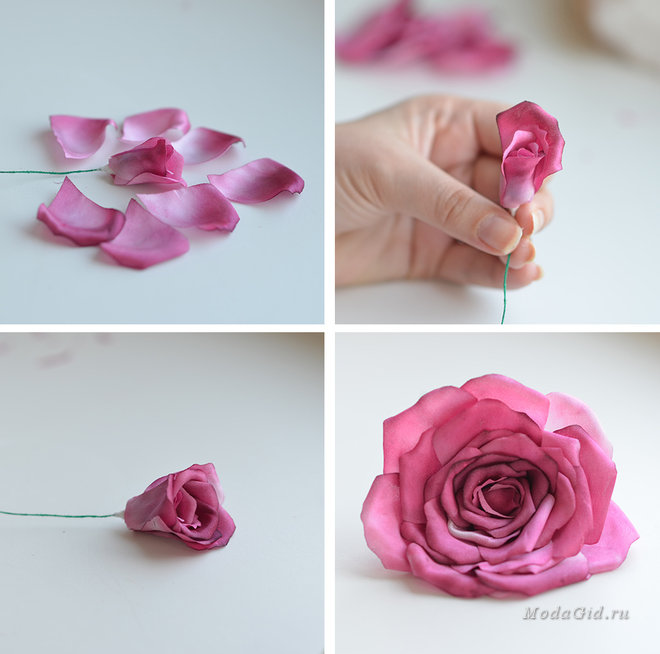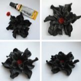 - Neatly straighten the petal so that the folds are preserved. At this stage, you can bend and curve the edges to your liking. This procedure must be done with all the petals, giving them a different shape. Then let it dry well. After drying, cut off a piece of wire for the stem, wrap a small piece of leather with a roll at the edge and bend it. It will be the core of the flower. Around her, on the glue "Moment" to glue the petals in a circle, forming a flower completely. You can add leaves made in the same way.