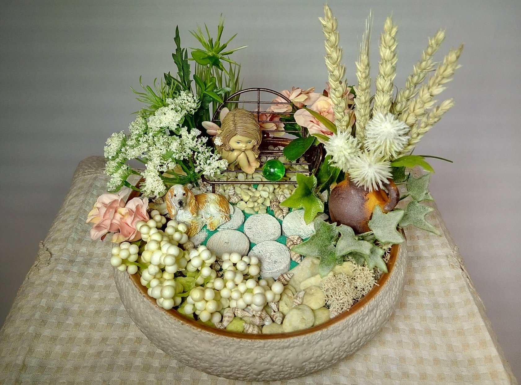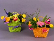 This ikebana is complemented by various pre-dried plants, sprigs, all sorts of twigs, satin ribbons, lace.All this can be bought in flower shops and departments for needlework.
