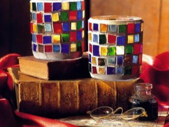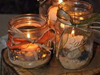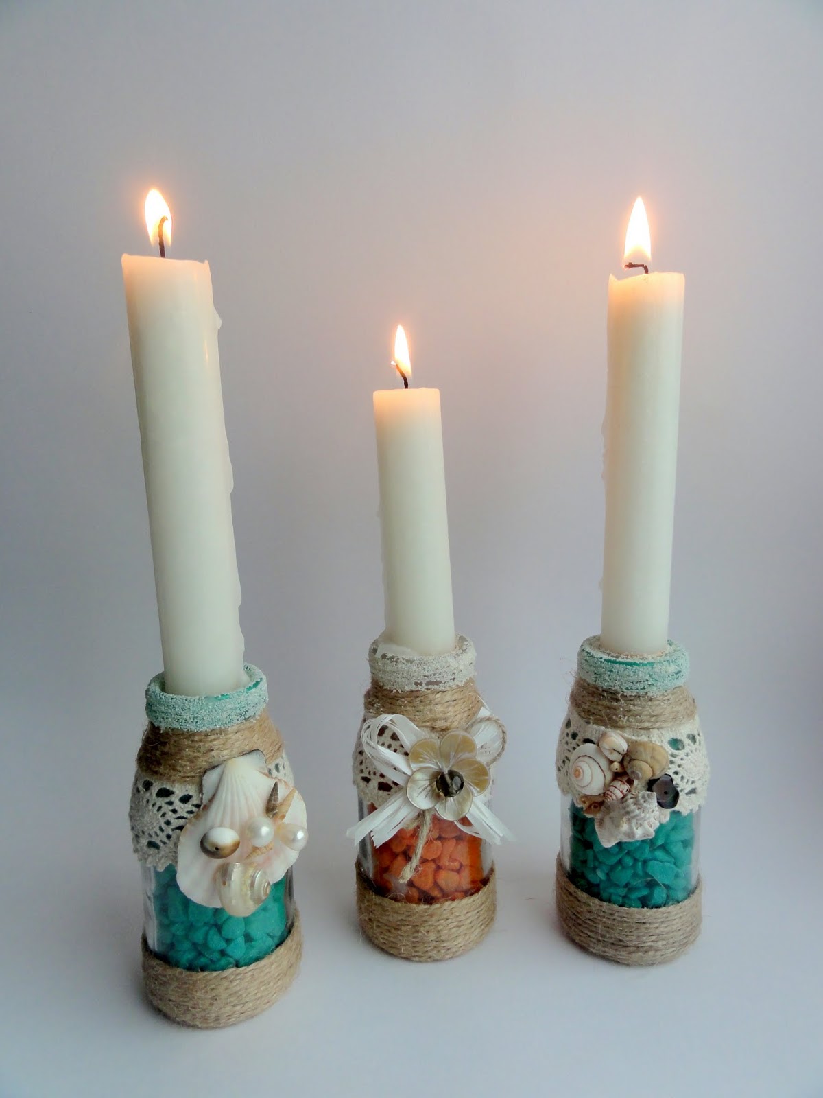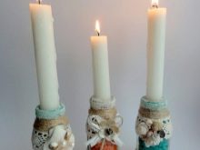 The next creative idea can be handmade candlesticks. They can also be made from glass jars. To do this, use containers of any size. It looks more interesting when the composition consists of banks of different height and width, decorated in the same style.