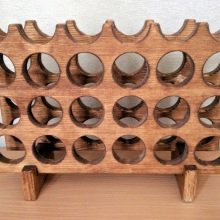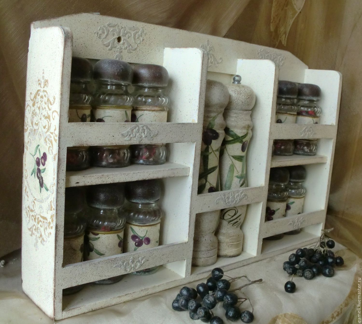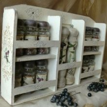 You can buy a stand for a set or do it yourself. For this you need plywood or wooden boards. Think about what shape it should be, make two blanks, use the jigsaw to cut out holes a little larger than jars, connect with corners and decorate in a suitable way so that the set looks harmonious. Or simply cover with craquelure or ordinary varnish.
