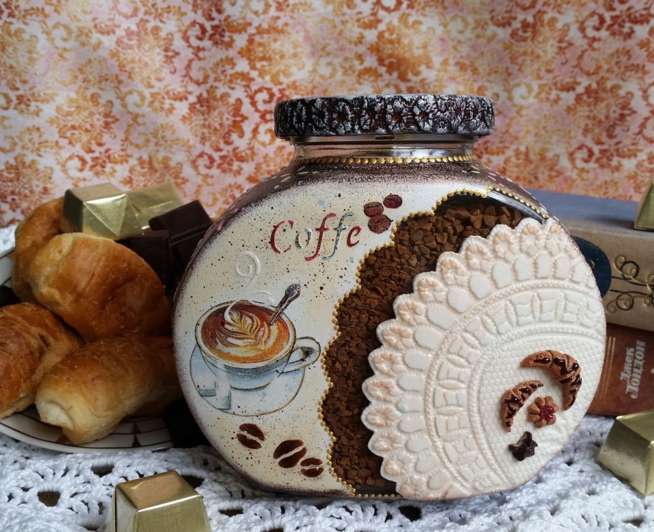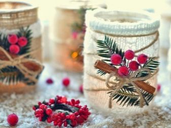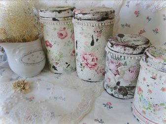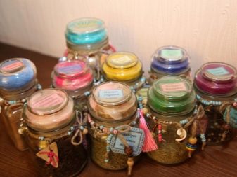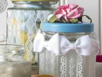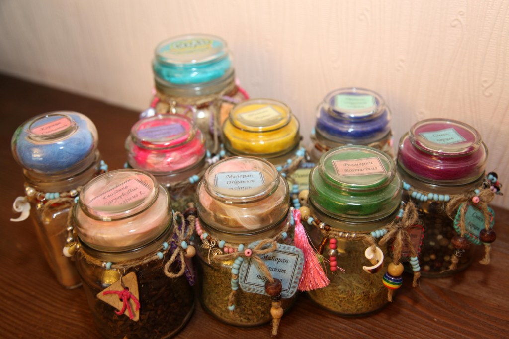 You can buy beautiful glass jars, or you can make a wonderful set from ordinary small jars of mustard, tomato paste, honey or something else. Beautiful design will turn out with the help of flax, flax lace, dried flowers, leaves or twigs, buttons, beads, beads, cuttings from cardboard, various decorative metal products, decoupage cards, paintings, threads, twine and so on.