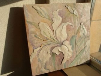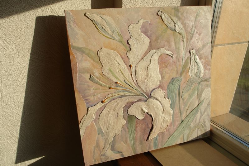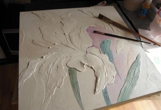 If you are not an expert in bas-relief, but really want to give such a gift, then the usual thick cardboard will help to simplify the task. Prime the canvas or other base, cut out the necessary details of the image from the cardboard. Those that should act more, make two times thicker, sticking together the same parts. In this way, form a complete image, which should be in the end. Glue everything to the base, after complete drying, prime again.