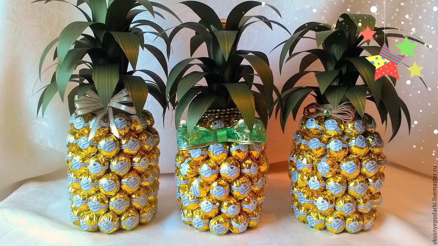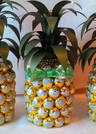 You can buy a plywood word and paint it, add decorative elements and donate it. Or put wooden skewers with chocolates on them in a beautiful pot. It turns out such a kind of bouquet of sweets.