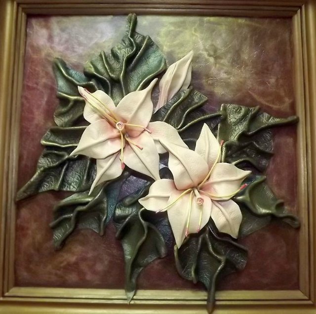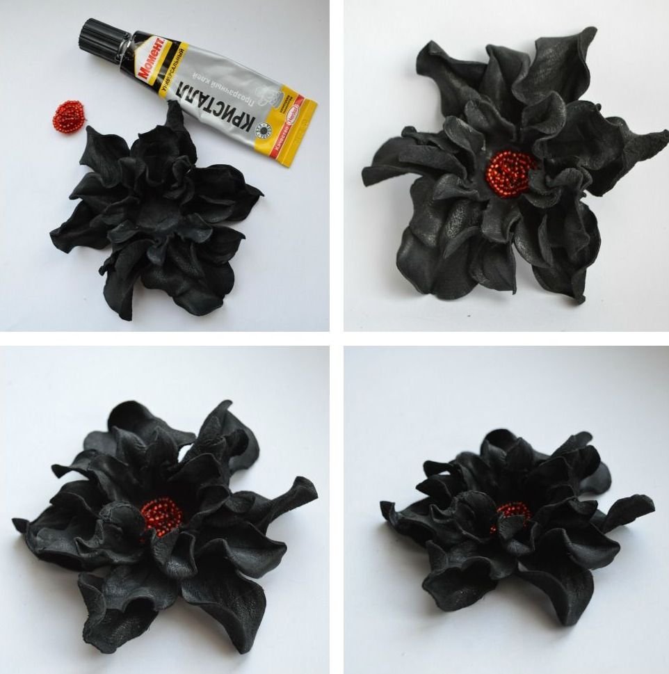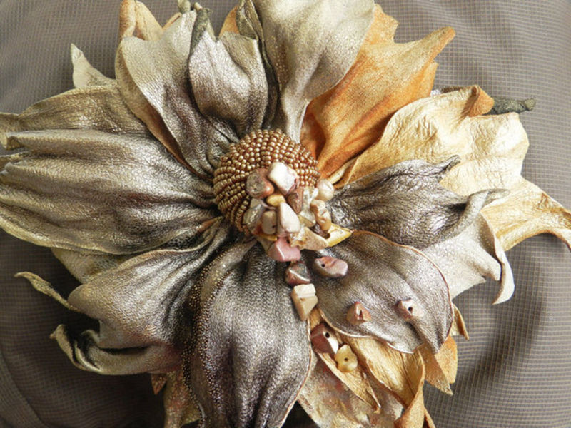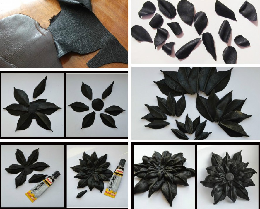 Interesting and unusual look leather flowers and if you still apply several shades of this material that are matched to the tone darker and lighter, then they are obtained as real. The manufacturing technique is very simple, the complexity is below average and even a beginner can handle it.