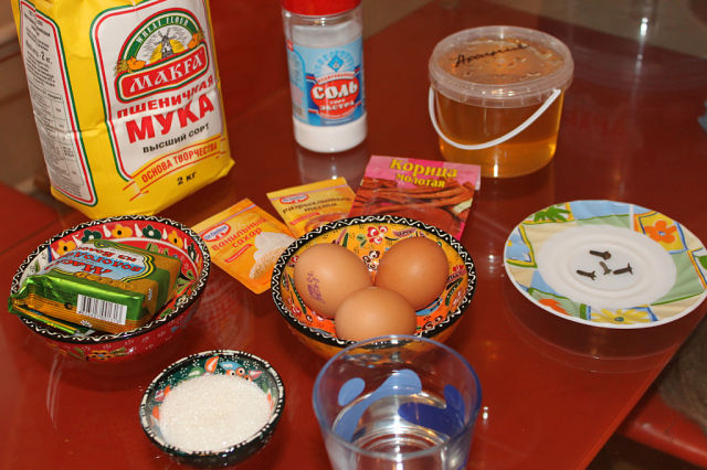 Add spices to honey, bring to a boil over low heat and cool to room temperature. Oil, yolks and sugar grind. In a separate bowl, mix the baking powder with flour. Combine the cooled honey with sugar, yolks and butter, add flour with baking powder and knead the dough. Roll out about 7 millimeters thick.